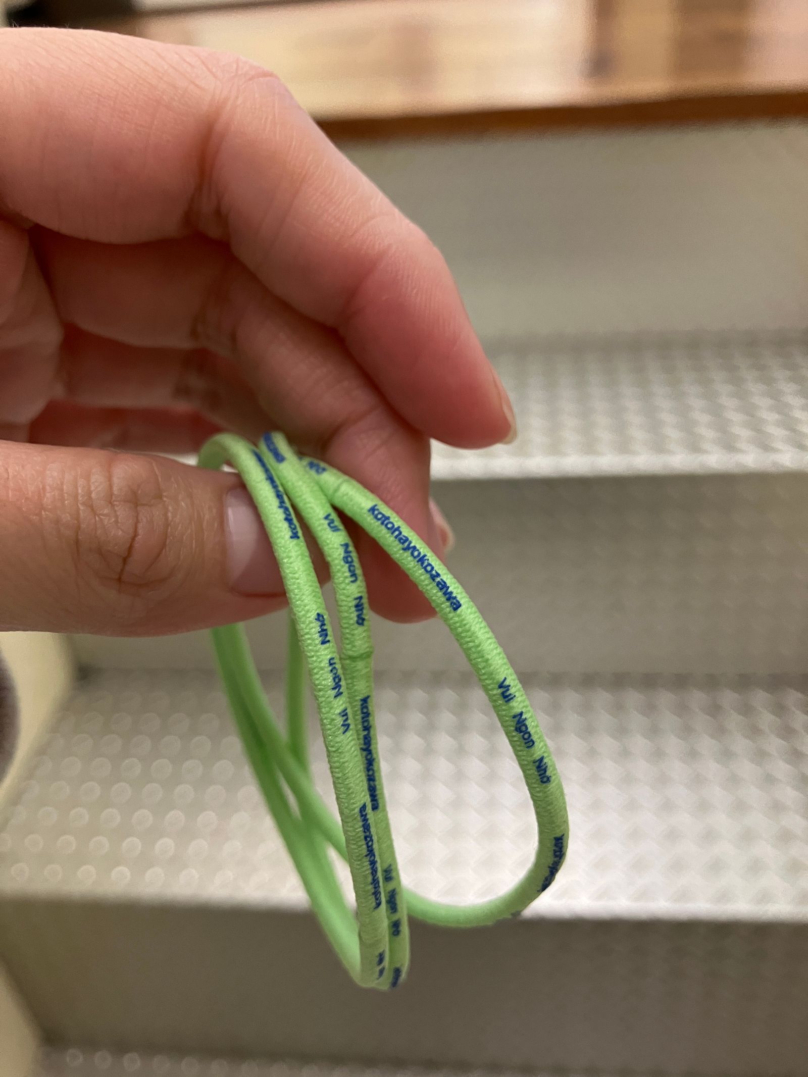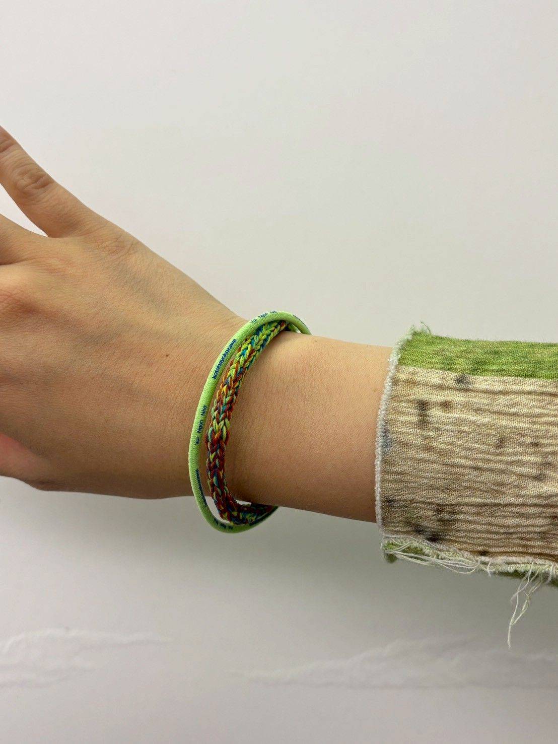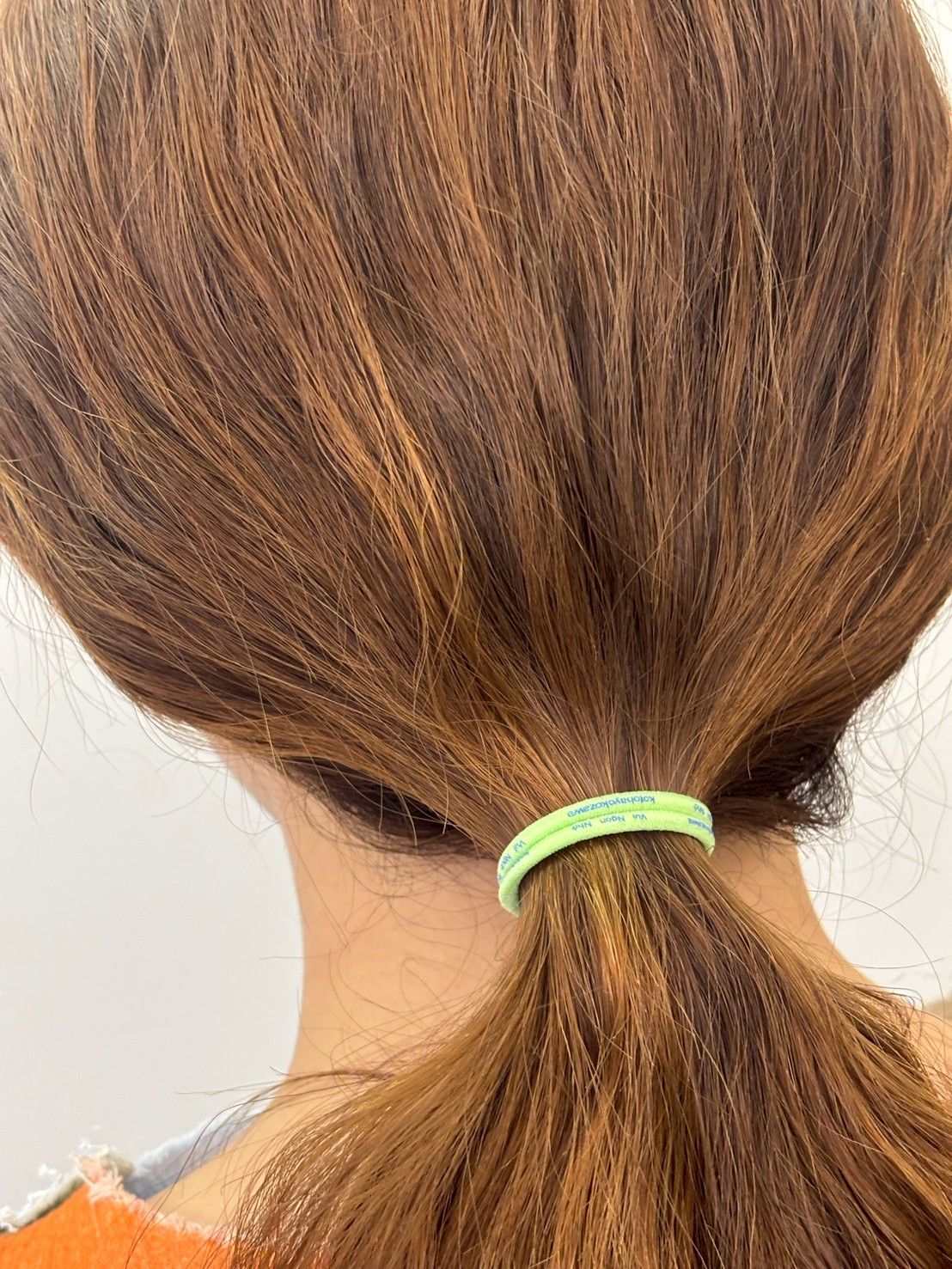 下げ札に付属する紐にはヘアゴムを採用、廃棄せず再利用できる仕様としています。ブランドのシグネチャーカラーでもあるライムグリーンが採用されております。
