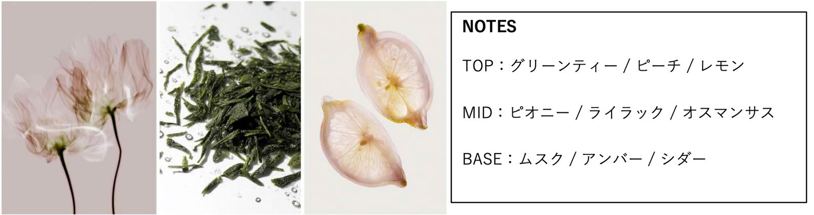 朝露に濡れた爽やかなグリーンティーと、鼻先をそっとタッチするレモンとピーチ。風にのってほのかに広がる豊かなライラックと、上品で優雅なピオニーの華やかなブレンドを、心地よいシダーウッドと温かなムスクが繊細に包み込み、落ち着いたフローラルの香りへと昇華していきます。まるで花々が咲く穏やかな庭園に佇んでいるかのよう。自然の息吹を感じるフレッシュフローラルの香り。