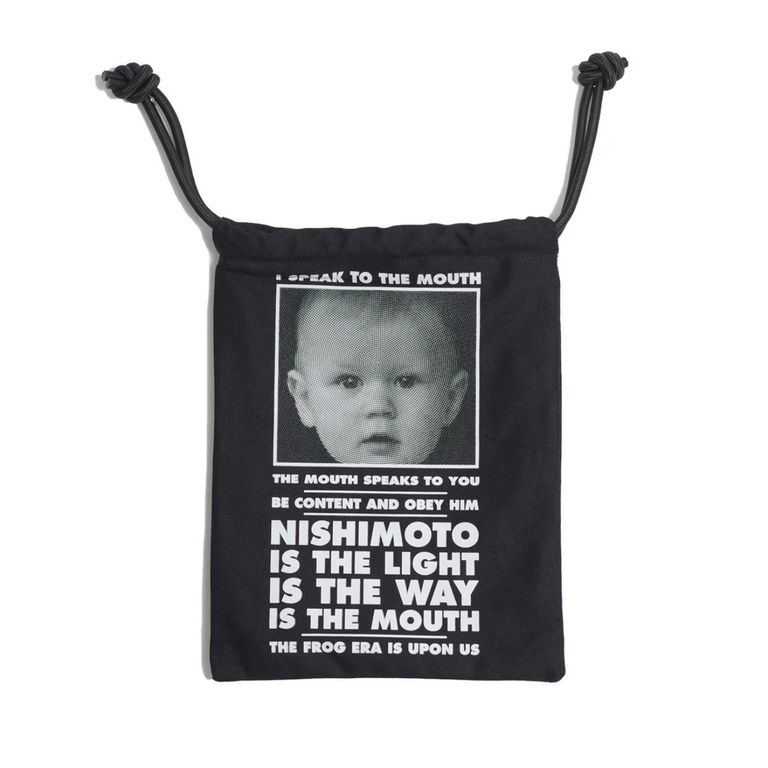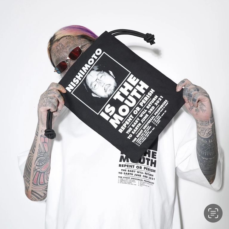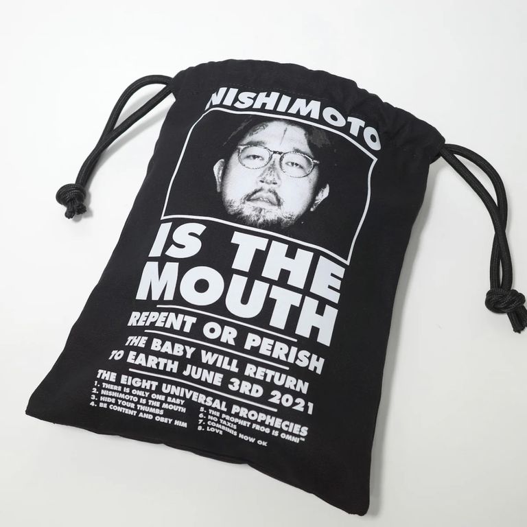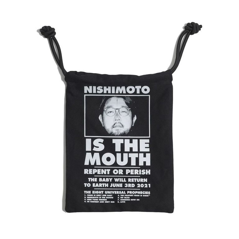 NISHIMOTO IS THE MOUTHは、架空のカルト宗教クラブから展開される日本のユニセックスブランド。Drake(ドレイク)、Virgil Abloh(ヴァージル・アブロー)、Tom Sachs(トム・サックス)、Peter Sutherland(ピーター・サザーランド)、他にも多岐にわたる世界的に有名なアーティストやデザイナー、写真家や作家などが、着用したことでアメリカを中心に注目され始める。当時は、友人、知人にのみ配布する形で流通されていたが、2020年より精力的に活動を開始。