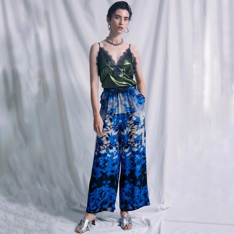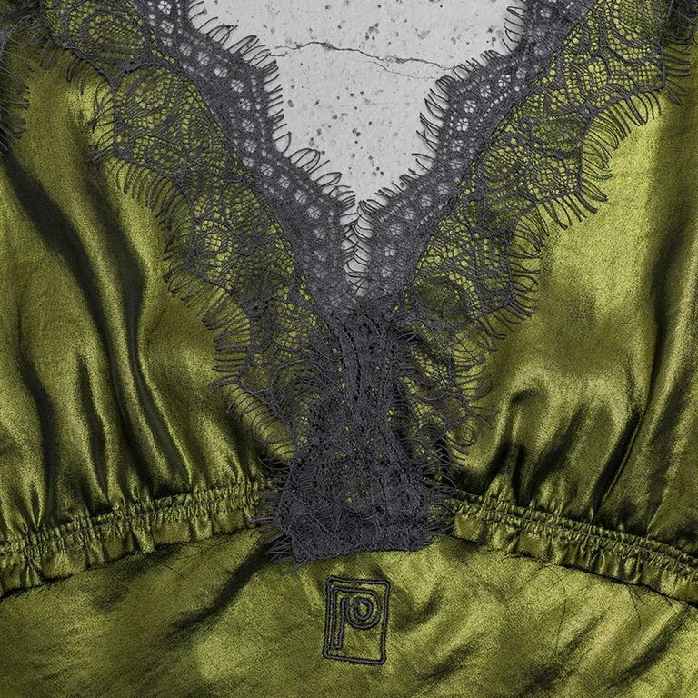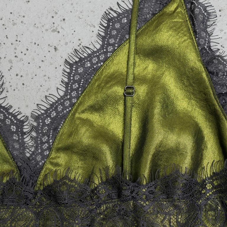 落ち感のあるサテン素材の上にカラーの箔を張った加工素材を使用し制作を行なった本作。メタリック素材とレース素材の”女性らしさ”と”スパイス”の効いた組み合わせが、特徴的なキャミソールです。