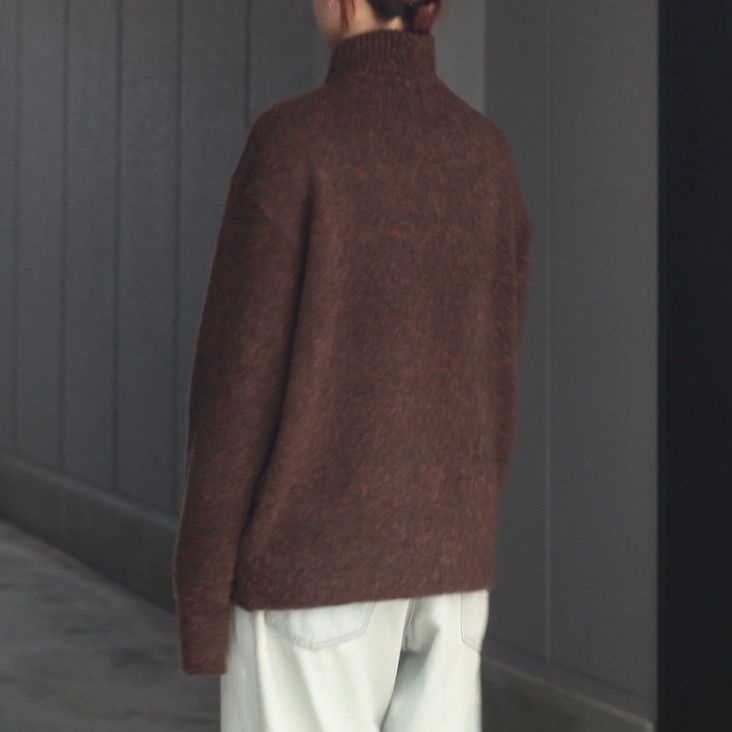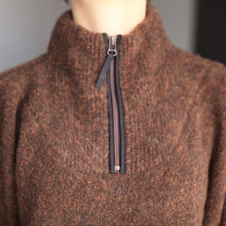 ブークレーヤーンを起毛をかいてフリース調にし製作を行なった本作。ハーフジップのプルオーバーセーターです。