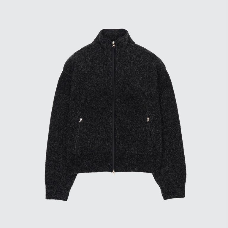 ブークレーヤーンを起毛をかいてフリース調にし製作を行なった本作。ジップ型のニットブルゾンです。