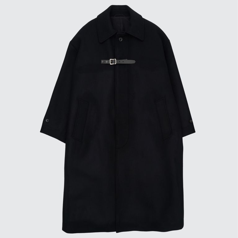 特徴的なフロントのレザーベルトはドットボタンで着脱可能。ベルトは量産ではフロント見返しに収納可能になります。大ぶりの衿はスタンドにしてボタンで止められ、襟裏には別生地を使用しコントラストをつけています。インナーのコントロール次第で幅広い季節でご愛用いただけるアイテムとなっております。