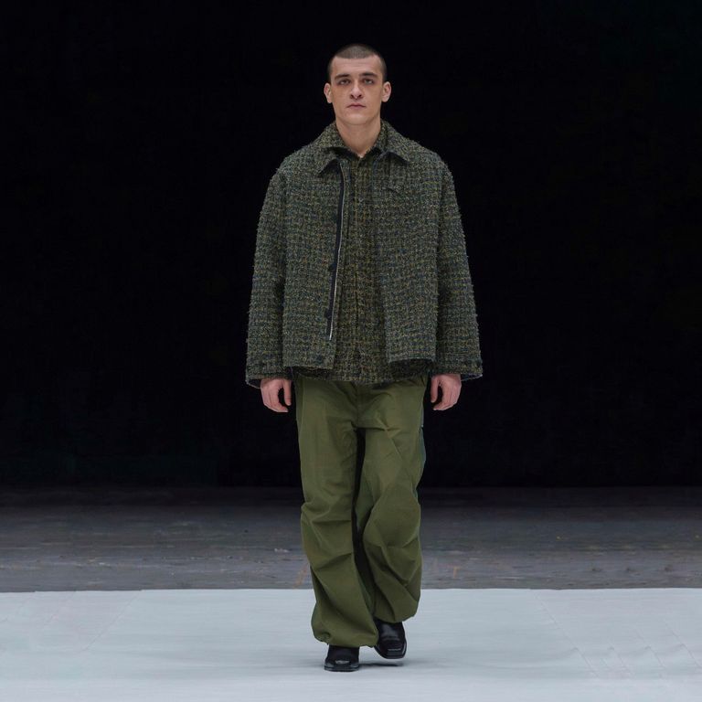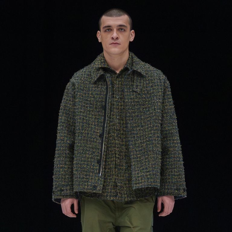 3色の異なる色の糸を1本の糸に撚り合わせて配色した3つ杢チェック生地。ウールツイードの様な表情に加え、ソフトで膨らみのある素材です。その2色のチェック生地をニードルパンチ加工施しました。ニードルパンチの機械で緯糸を生地の表に掻き押し出したものを更にもう1回ニードルパンチをしてチェックの柄がボヤけるようにしています。