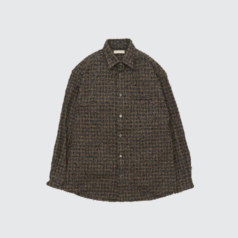 ニードルパンチ加工が施されたチェック生地を使用し製作を行なった本作。レギュラーカラーのロングスリーブシャツです。
