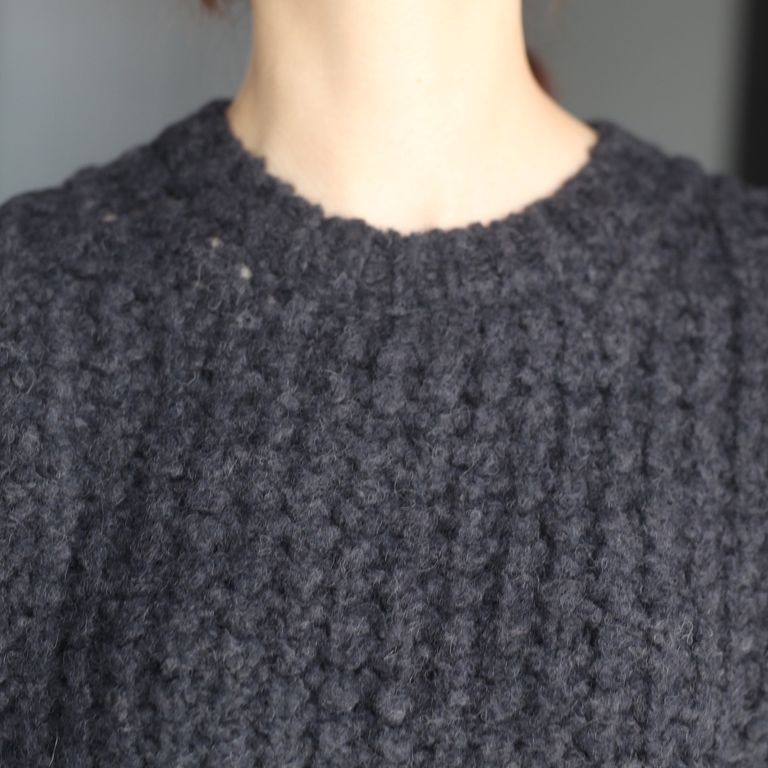 ベビーアルパカのブークレーヤーンを使用し製作を行なった本作。ビックワッフル編みのクルーネックセーターです。
