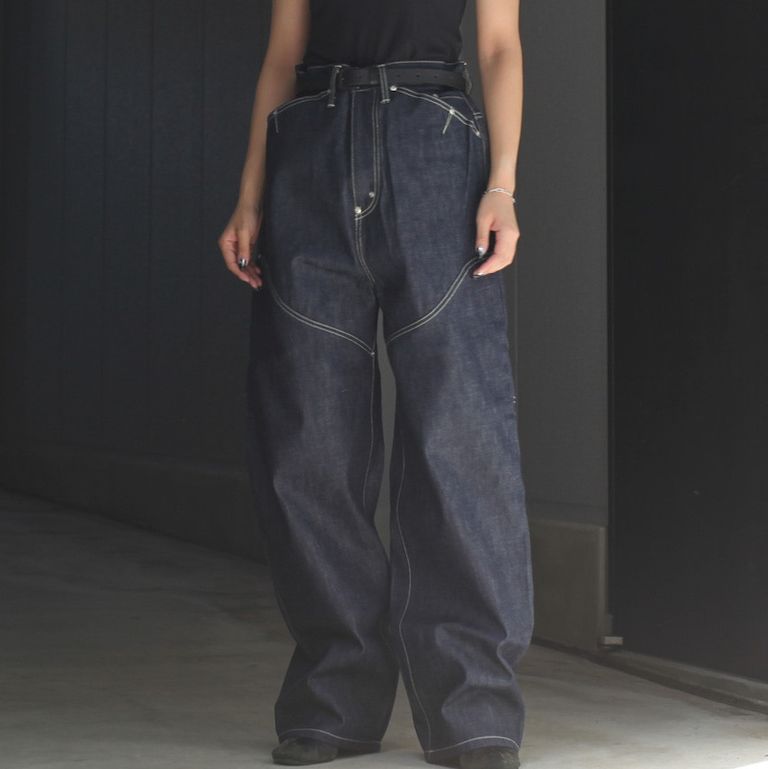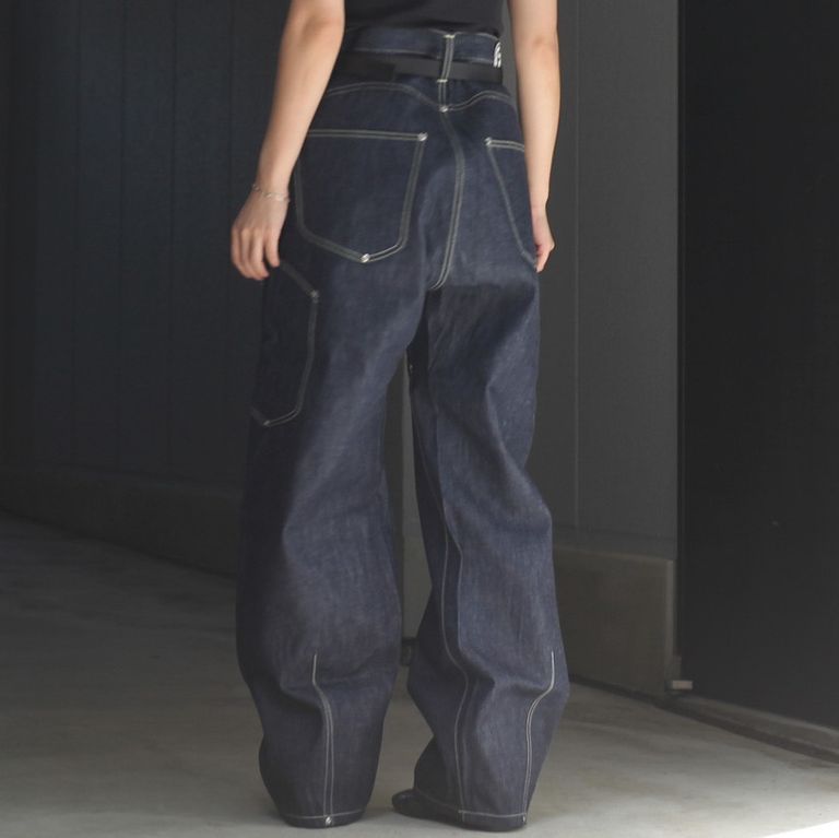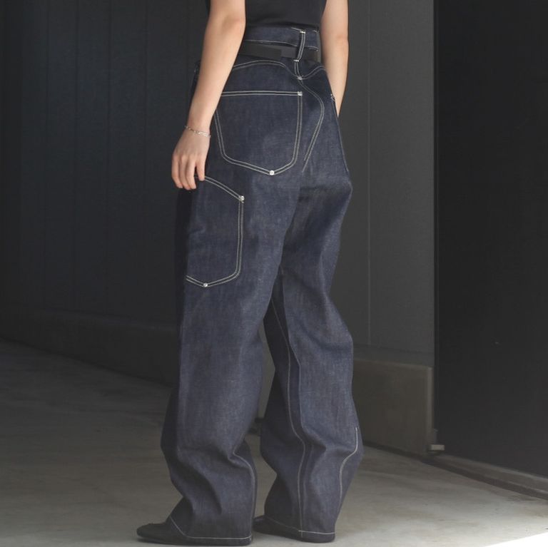リジットデニムならではの硬さと無骨さを残し、穿き込むほどに自分だけの風合いが楽しめる1着。ハイウエストでもローウエストでも着用可能なデザインで、気分やスタイルに合わせて自在にアレンジ可能。カーペンターパンツ特有のディテールを取り入れ、ワークウェアの実用性とカジュアルな雰囲気を融合させています。
