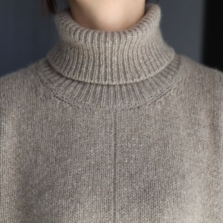 カシミヤと、カシミヤよりも繊維が細いセーブルの毛をブレンドした素材を使用し、ネップヤーンに仕上げたもので製作を行なった本作。程よくゆとりのあるタートルネックニットです。