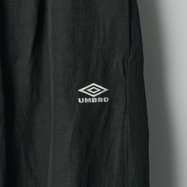 スポンジライクなナイロン糸とハリの強いリネンを交織したことによる独特なぬめりのある生地感も特徴的です。両脇部分には曲線のはぎ、極細のパイピングが施されております。ピスポケットは両玉縁仕様。左ポケット部分のUMBROのロゴがポイント。オールシーズンでご愛用いただけるお奨めアイテムとなっております。