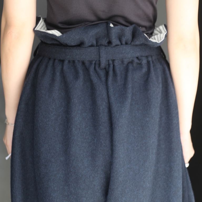 尾州産の上質なウール素材を使用し製作を行なった本作。同素材で作られたベルト付きのバギースラックスです。