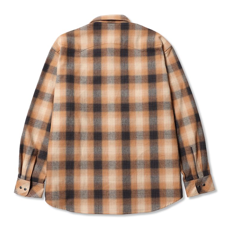 新潟県長岡市の栃尾産地にて、4色の色糸を使用したオリジナルオンブレチェック生地を採用し製作を行なった本作。ウエスタン仕様のL/Sシャツです。