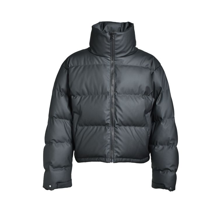 マットな質感のフェイクレザー素材を使用し製作を行なった本作。ボリューム感と口元まであるハイネックデザインが特徴のダウンジャケットです。