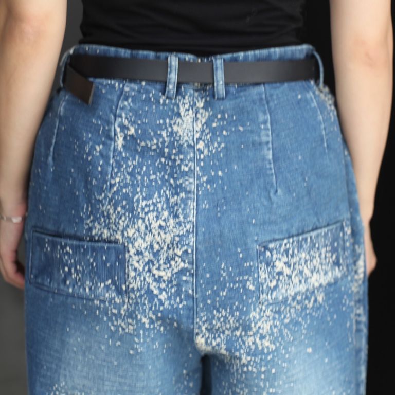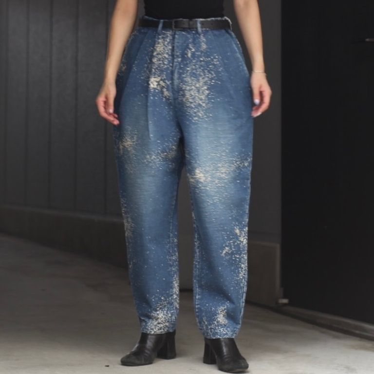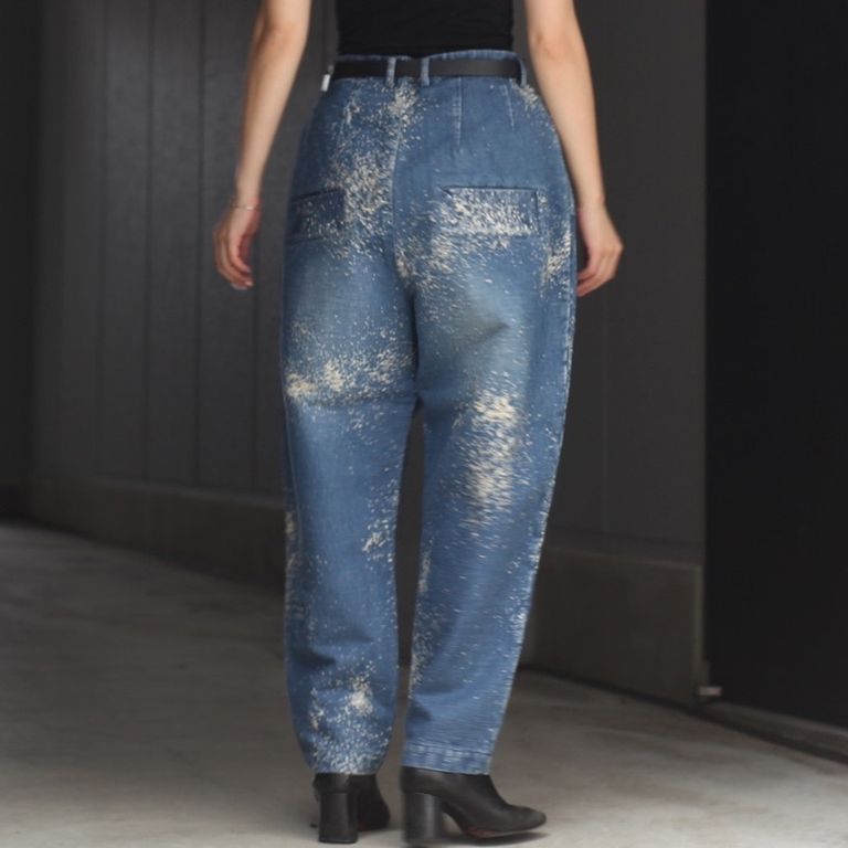 オリジナルのジャカード織デニムを使用し制作を行なった本作。裾にかけてテーパードが効いたワイドデニムパンツです。