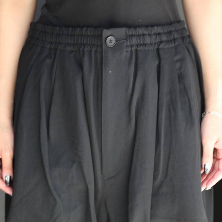 72番手の双糸を使用したウールギャバジンを採用し製作を行なった本作。膝回りにタックが施されたイージー仕様のワイドトラウザーです。