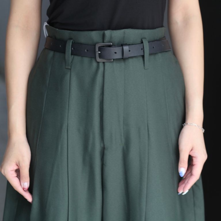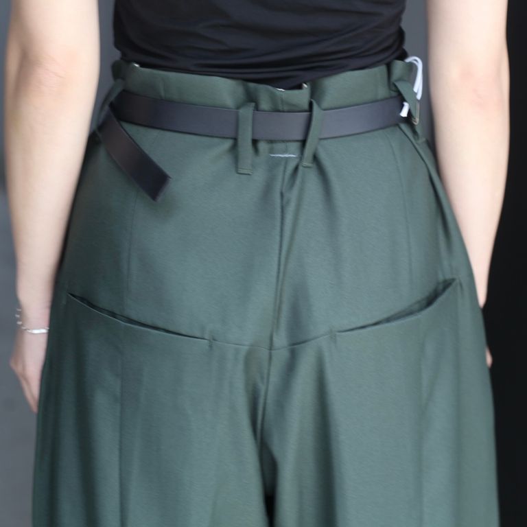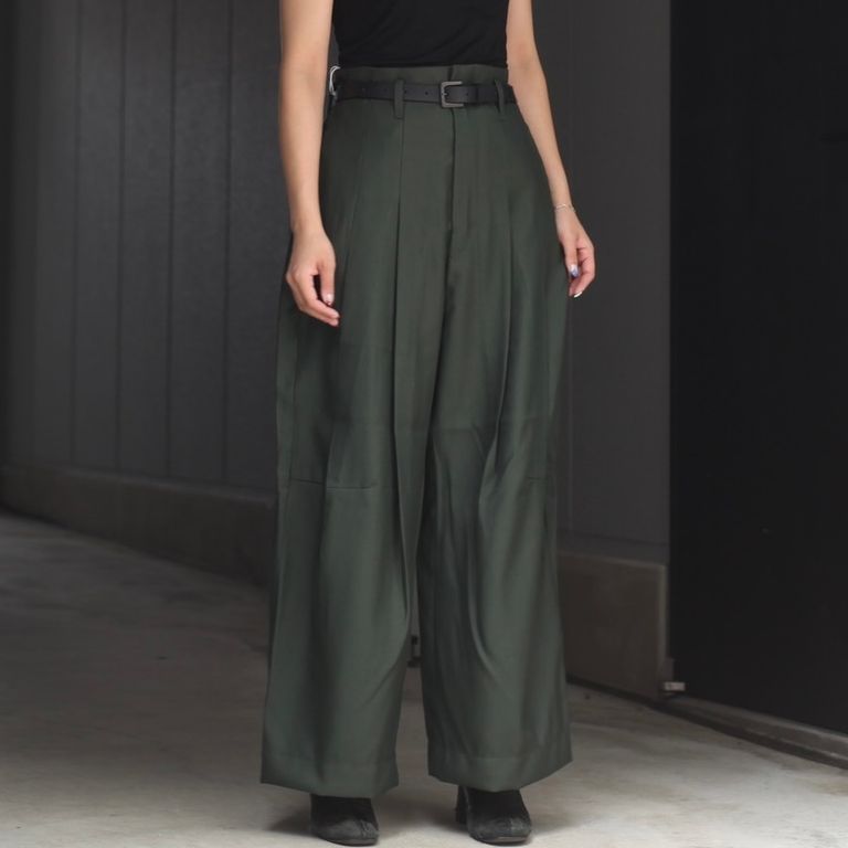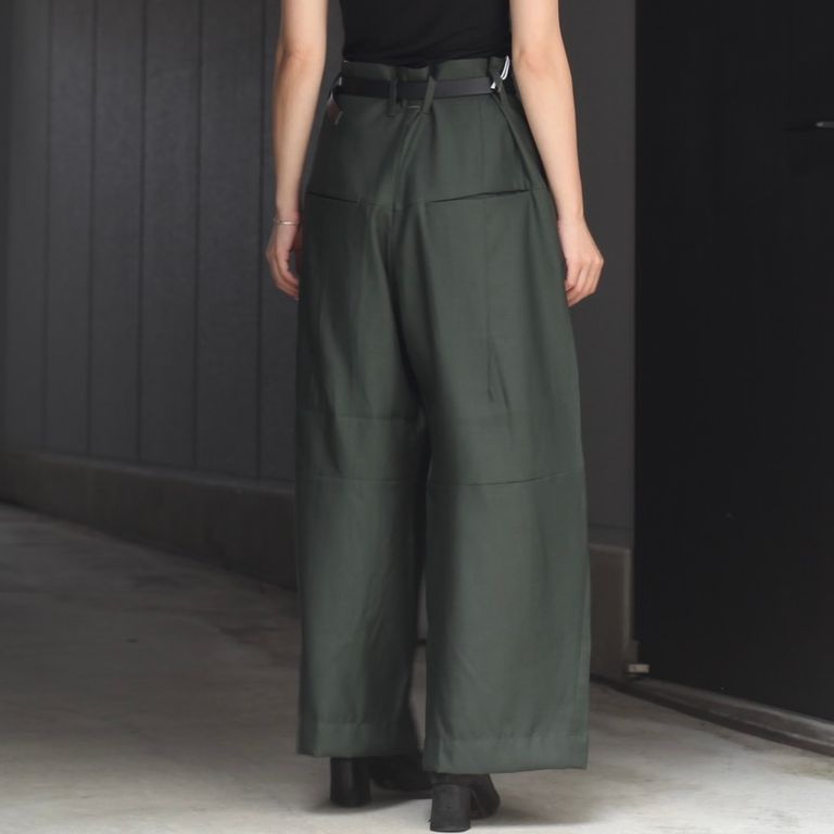 生地は「STA-PREST(ステイ・プレスト)」でも用いられるポリエステルツイルを使用。深い2タックを入れ、中縫いを長めに入れることによって腰回りをすっきりとさせながら大胆な太さを出しています。膝裏あたりに切り替えを入れ、少し足が曲がったようなシルエットになっているのも特徴です。幅広いシーズンでご愛用いただけるお奨めアイテムとなっております。