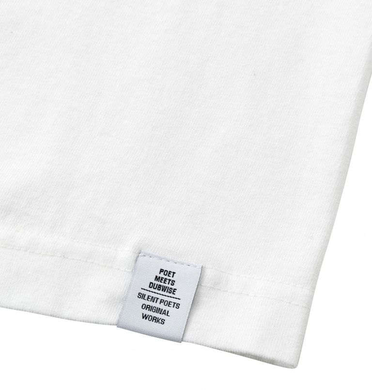 POET MEETS DUBWISEは音楽とデザイン、そしてカルチャーが常に隣り合わせにあるデザイナー下田氏のキャリアが投影されたプロジェクト。機能美や着心地を必要最小限にとどめたベーシックなアイテムには、SILENT POETSから連想されるキーワードや曲名をタイポグラフィとしてデザイン。