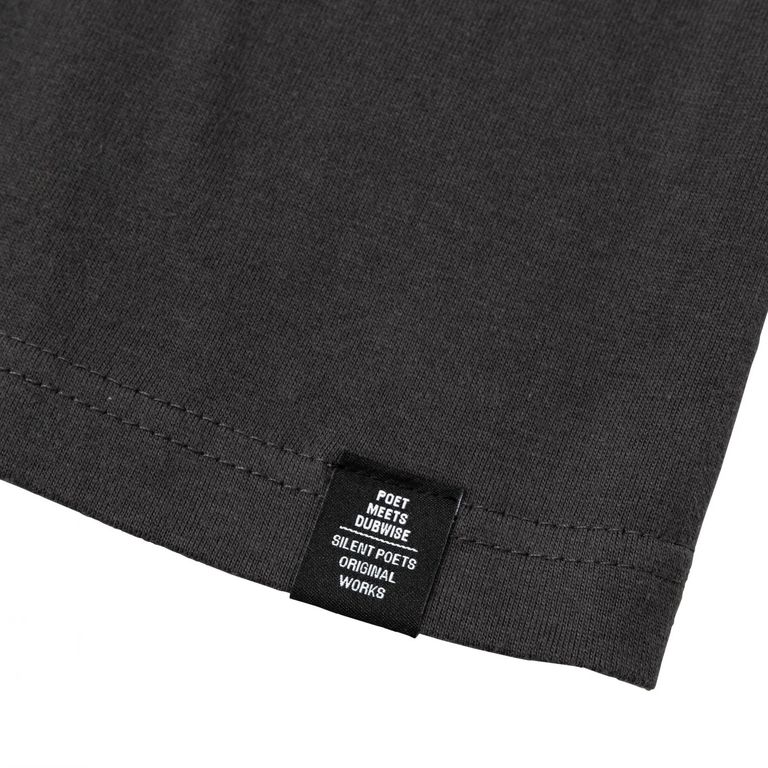 POET MEETS DUBWISEは音楽とデザイン、そしてカルチャーが常に隣り合わせにあるデザイナー下田氏のキャリアが投影されたプロジェクト。機能美や着心地を必要最小限にとどめたベーシックなアイテムには、SILENT POETSから連想されるキーワードや曲名をタイポグラフィとしてデザイン。