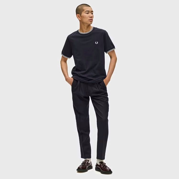 ネックと袖リブにフレッドペリーのシグニチャーであるティップラインを施したクルーネックTシャツ。