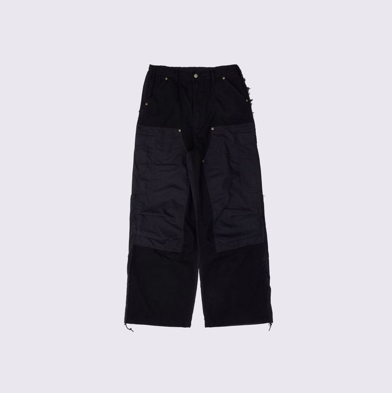 ダブルニーのワークパンツとM-65カーゴパンツをドッキングし製作を行なった本作。マックス・エルンストのコラージュを技法を、2種類の異なるパンツ再構築したパンツです。