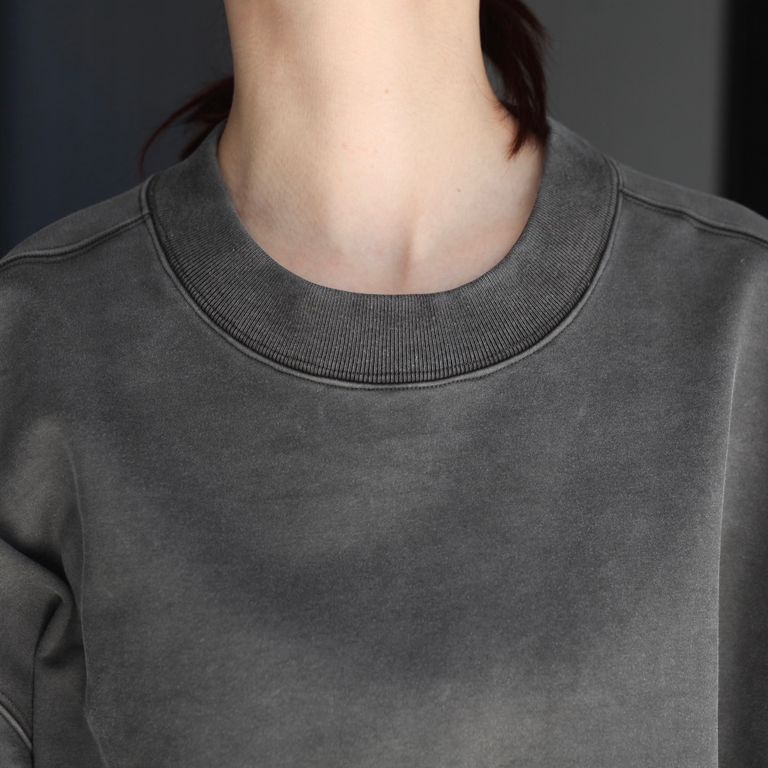 日本に1台しか無い、36G裏毛機で編立てることで、今までにはない唯一無二の素材を実現。表面に、超繊細な微起毛を掻くことで何とも言えないヌメリ感があり、ハイゲージと相まってより柔らかい風合いとなっております。 洗いを施すことにより、洗濯後の縮みなどがより無いように仕上げられています。