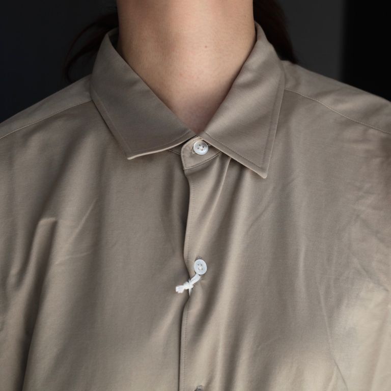 46Gというスーパーハイゲージで、タイプライターという織物の高密度平織組織を実現した本作。ゆったりとしたシルエットの“atmosphere” 空気を纏うレギュラーカラーシャツです。