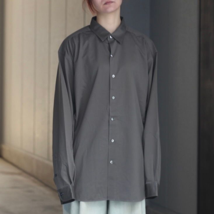 46Gというスーパーハイゲージで、タイプライターという織物の高密度平織組織を実現した本作。ゆったりとしたシルエットの“atmosphere” 空気を纏うレギュラーカラーシャツです。