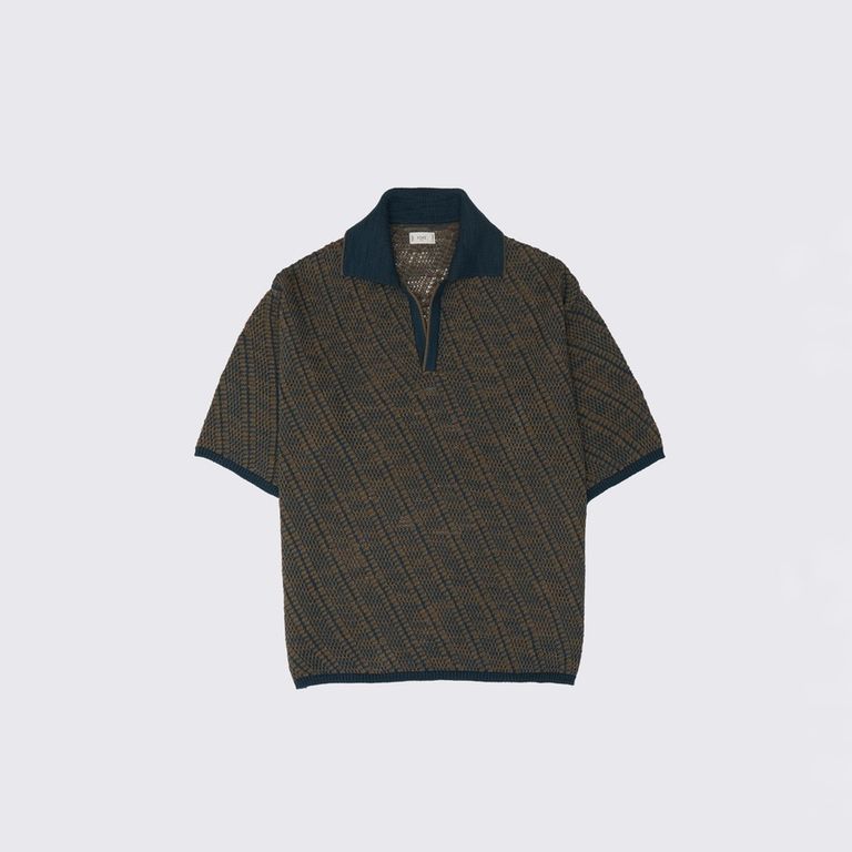 コットンのストローヤーンを使用し製作を行なった本作。スキッパー型のニットシャツです。