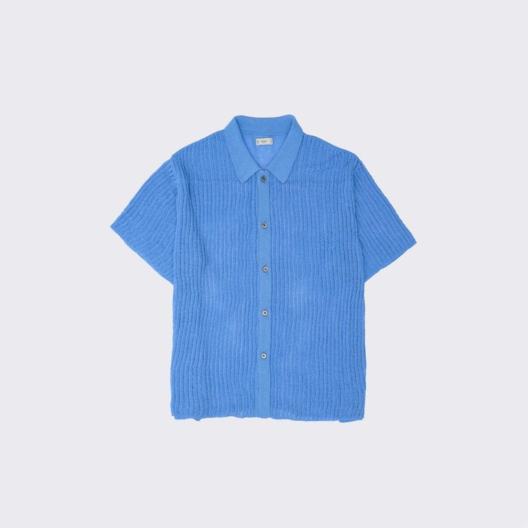 コットンネップとナイロンを複合したガーゼ調の素材を使用し製作を行なった本作。涼しげな印象のニットシアーシャツです。
