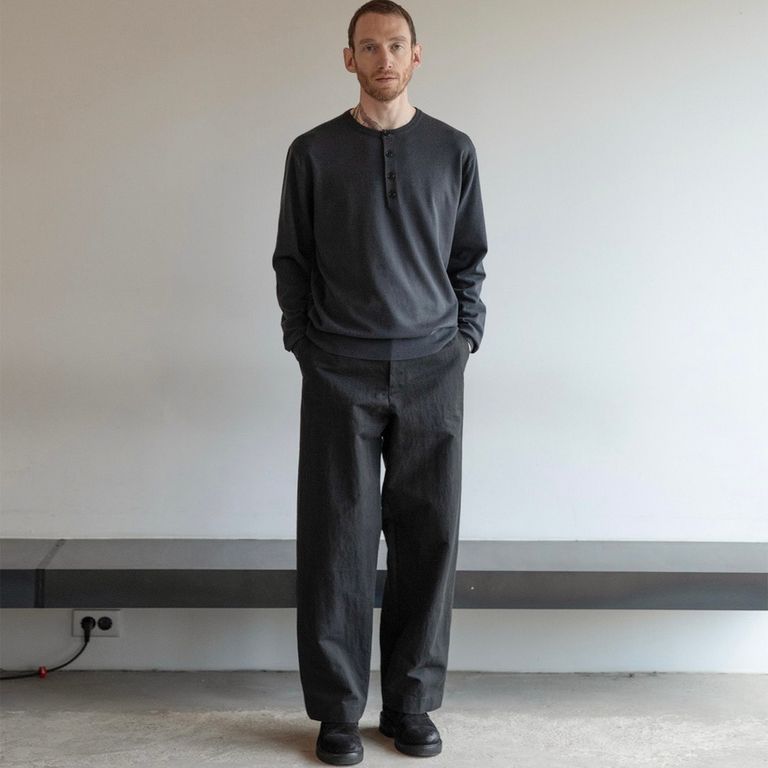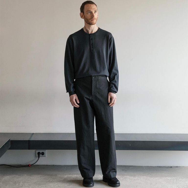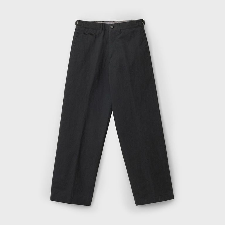 コーマ59番手糸の超高密度DTY糸で織られたCN素材を使用し製作を行なった本作。カーブしたシルエットが特徴的なチノパンツです。
