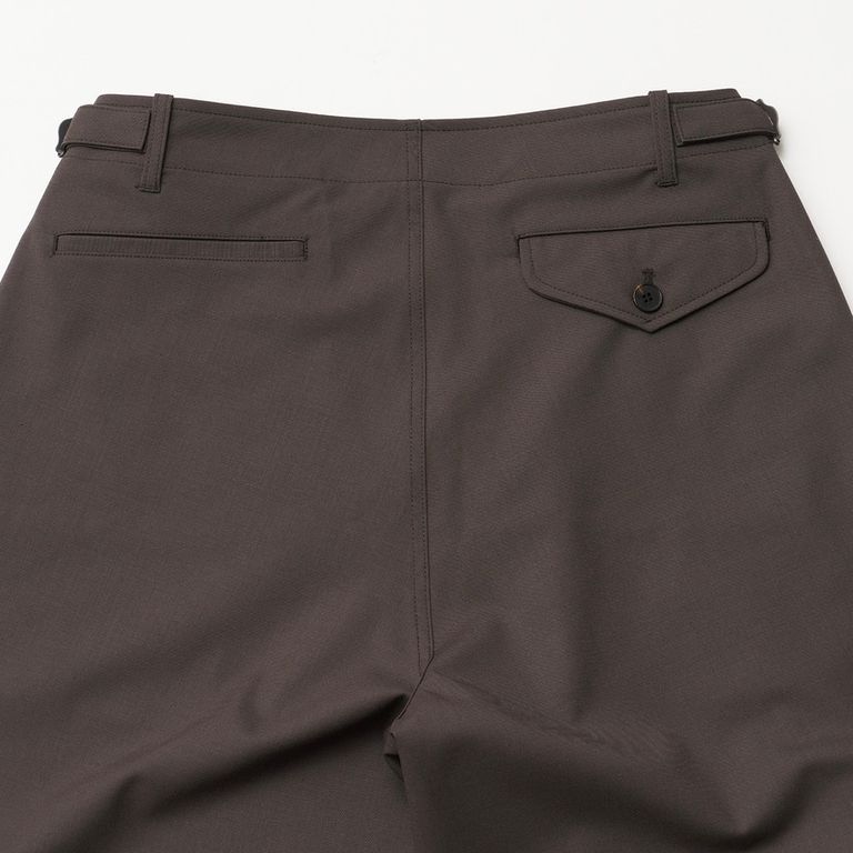 ウール配合による高級感のある表面感が魅力で、スパン素材であるゼントラが優れた伸縮性、回復性、形態安定性を持ち合わせています。ウエスト部分には牛角ボタンを採用し、高級感をプラスしました。
