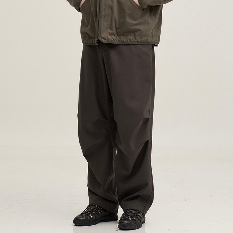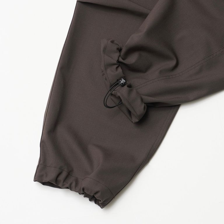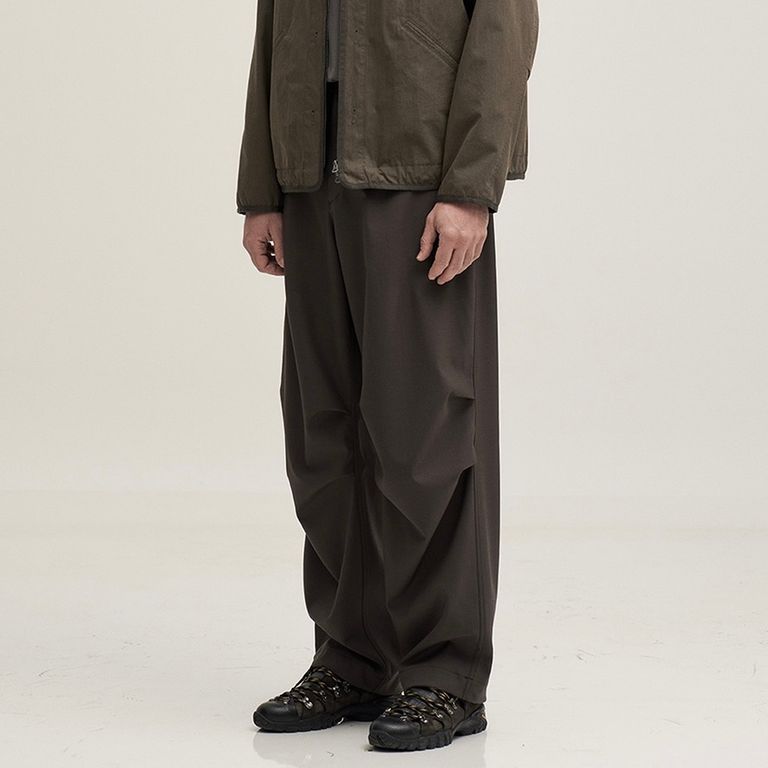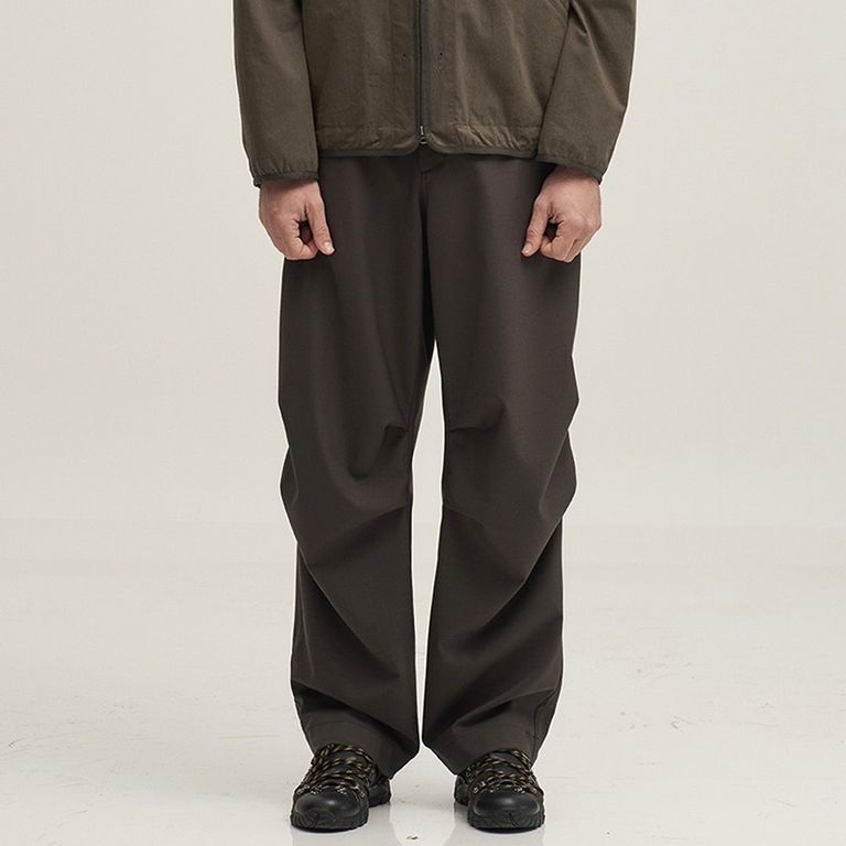 程よいゆとりのあるフィット感とすっきりとしたシルエットで、汎用性の高い一本です。膝部分にはタックのディテールがあり、流れるようなシルエットで快適な穿き心地を提供します。裾の内側のドローコードとウエスト部分の開口部により、好みに合わせてシルエットを調整できます。