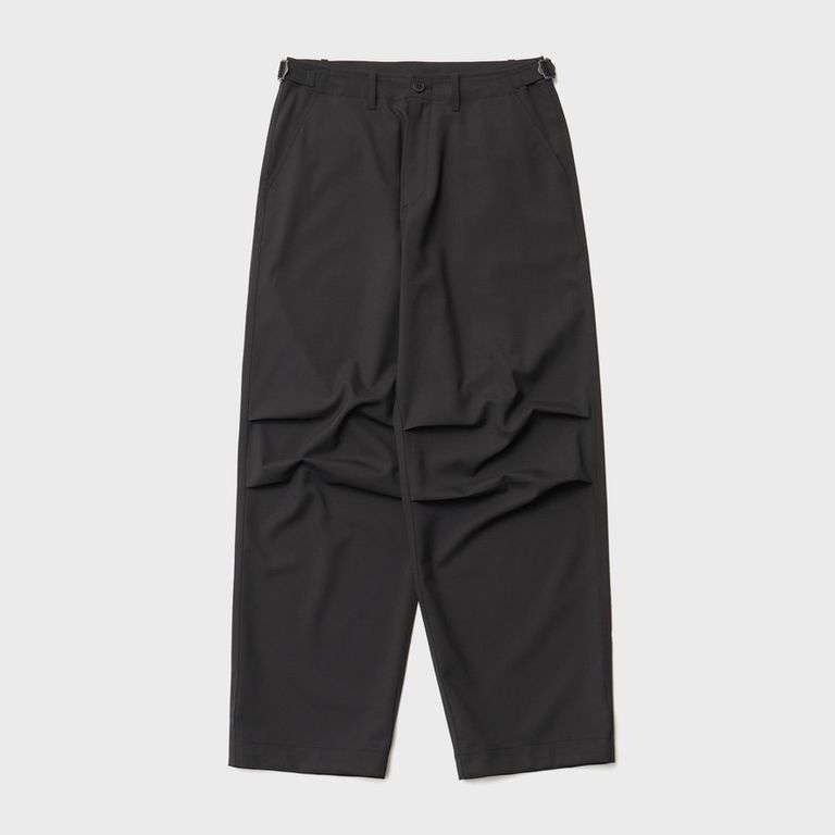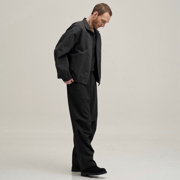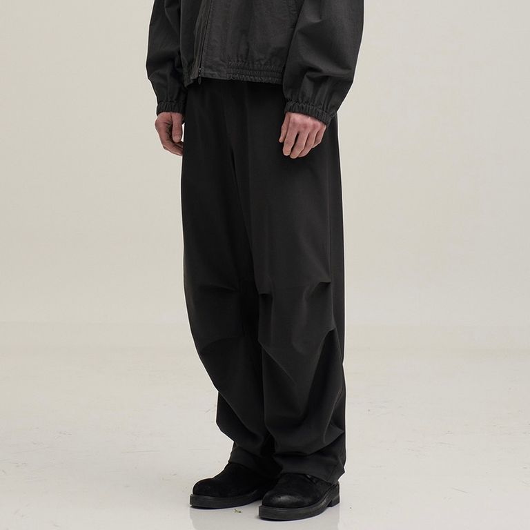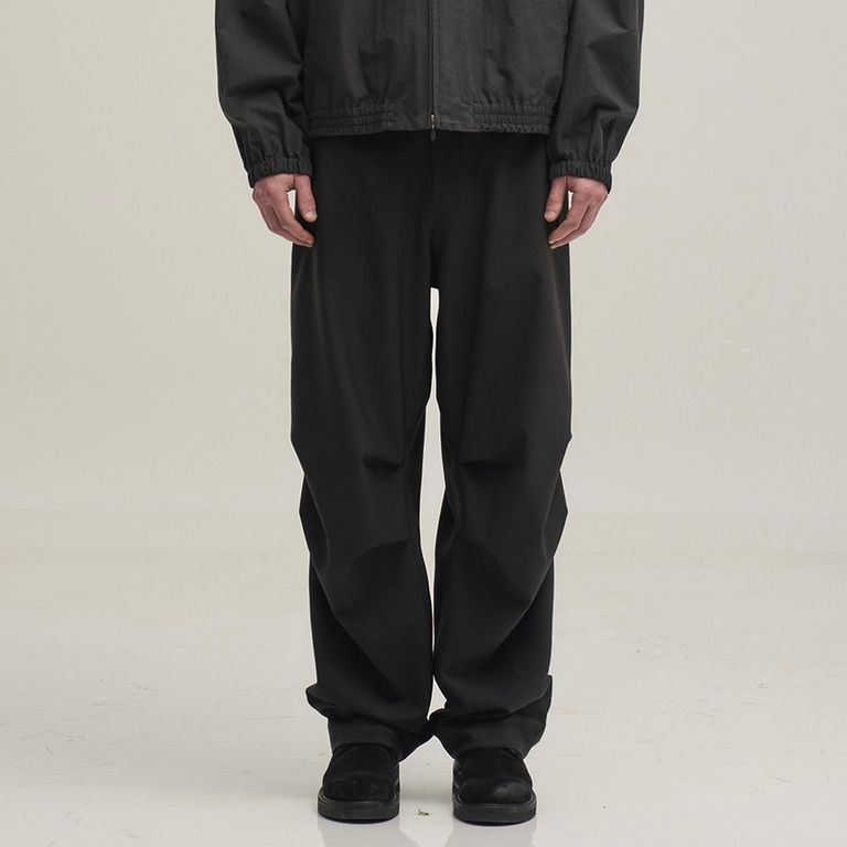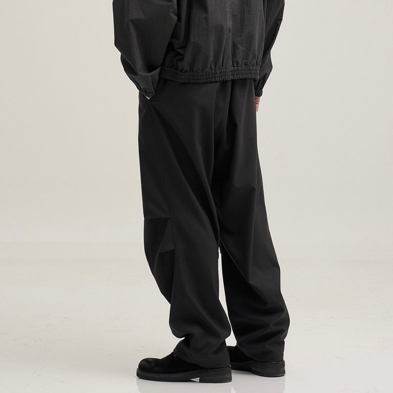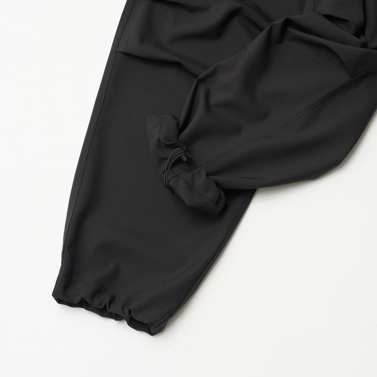 程よいゆとりのあるフィット感とすっきりとしたシルエットで、汎用性の高い一本です。膝部分にはタックのディテールがあり、流れるようなシルエットで快適な穿き心地を提供します。裾の内側のドローコードとウエスト部分の開口部により、好みに合わせてシルエットを調整できます。