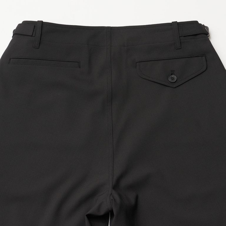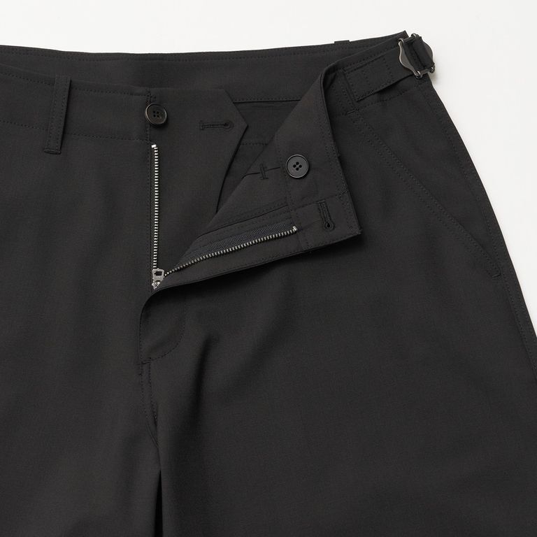ウール配合による高級感のある表面感が魅力で、スパン素材であるゼントラが優れた伸縮性、回復性、形態安定性を持ち合わせています。ウエスト部分には牛角ボタンを採用し、高級感をプラスしました。