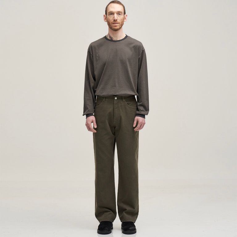ており、173g/m2と薄手ながらもしっかりとした素材感で、暖かい季節でも気軽に着用できます。モリト社のリベットや裾のチェーンステッチなど、デニムのディテールをそのまま取り入れたアイテムです。程よいセミワイドストレートフィットで、様々なトップスやアウターと相性抜群です。幅広いシーズンでご愛用いただけるお奨めアイテムとなっております。