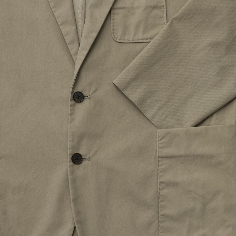 染色されていない生地で製品の縫製を終えた後、染色と洗濯作業をするガーメントダイイング技法で完成したジャケットです。ガーメントダイイング製品の特性上、洗濯すればするほど生地の色が少しずつ薄くなりまるでデニムのように素敵で独特なエイジングが生まれます。適度なゆとりのあるフィット感とすっきりとしたシルエットで汎用性が高くデニム、チノパンなど様々なボトムスとのマッチングが可能なアイテムです。