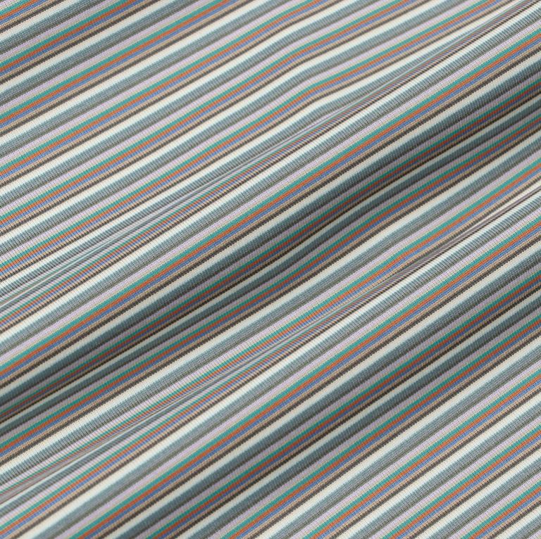 定番のストライプ生地をより薄くし、真夏でも着用できる素材感で製作。独特の透け感とイージーケア性が特徴です。ディティールは、ドレスシャツを採用し全て巻き伏せ本縫い仕様、貝蝶釦使いです。二浴染めという、別の素材を二種の染液に連続して染め、細かいボーダー柄素材を作成。我々にしか作成できないシャツとなります。