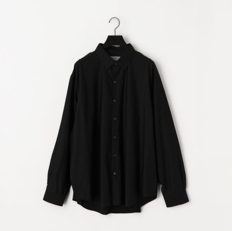 46Gという、スーパーハイゲージで、タイプライターという織物の高密度平織組織を実現した本作。程よい肩幅から裾に向かってストンと落ちるシルエットは名前通り控え目なレギュラーカラーシャツです。