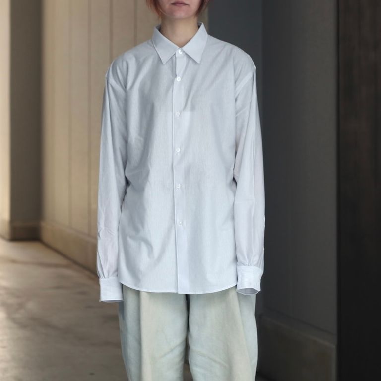 46Gという、スーパーハイゲージで、タイプライターという織物の高密度平織組織を実現した本作。程よい肩幅から裾に向かってストンと落ちるシルエットは名前通り控え目なレギュラーカラーシャツです。