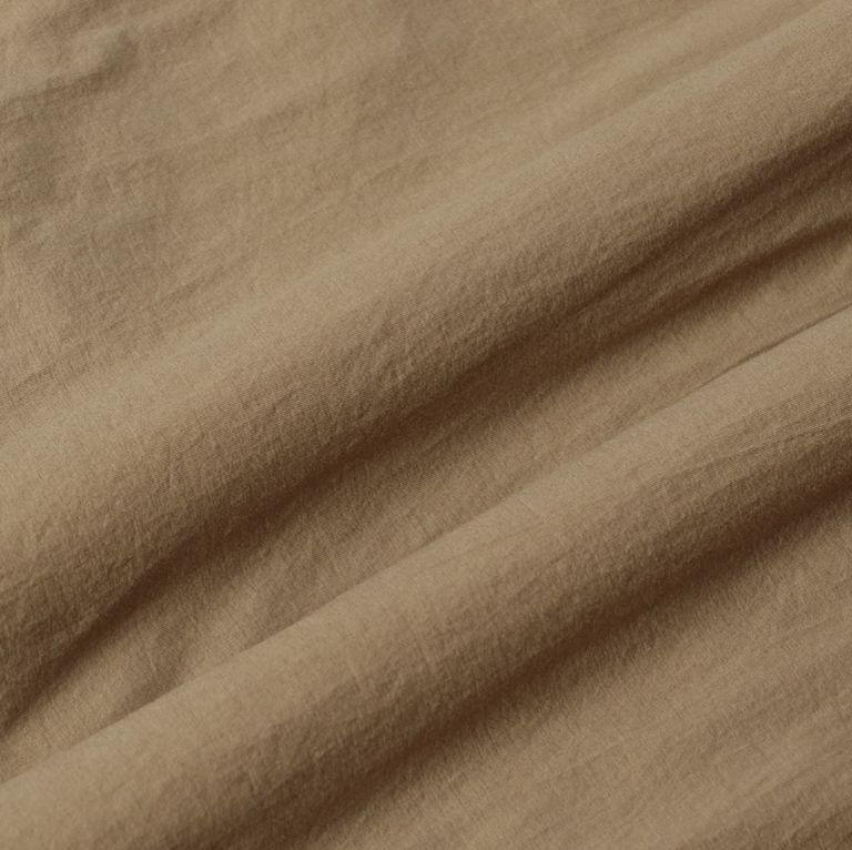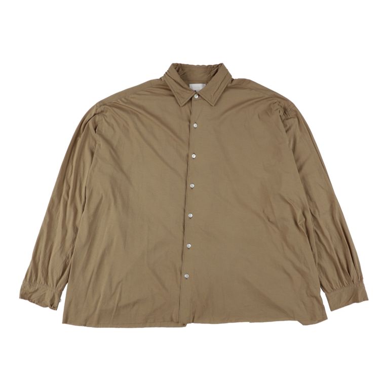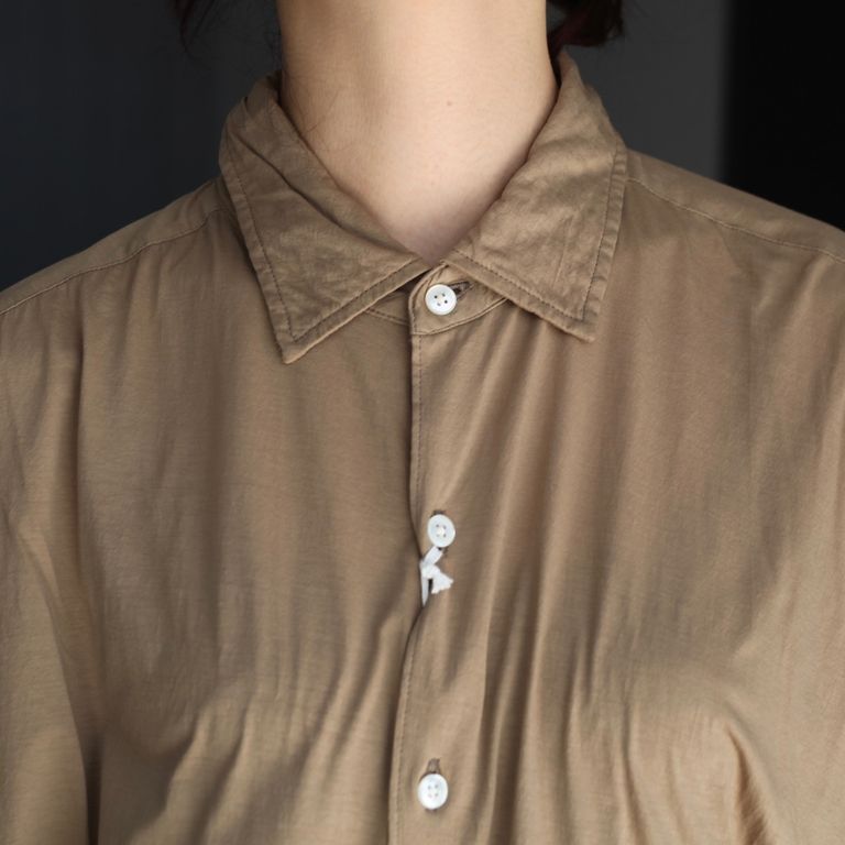 裾、袖、ポケットの切りっぱなし、ヨーク、カフスのギャザーなど日本国内の縫製工場で作成しております。身幅をしっかりとったボックスシルエットが特徴。着用時のドレープなどは他にない雰囲気のシャツとなります。芯地を極力使用しないことで、生地の風合いのみでシルエットを構築しております。オールシーズンでご愛用いただけるお奨めアイテムとなっております。