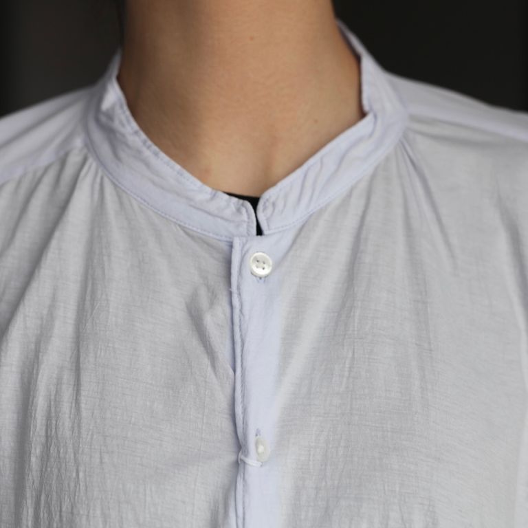 塩縮加工を施した80/1リサイクルスビンコットンを100%使用し製作を行なった本作。独特なシボ感がある素材が特徴のスタンドカラーシャツです。