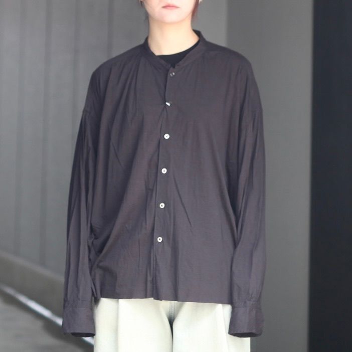 塩縮加工を施した80/1リサイクルスビンコットンを100%使用し製作を行なった本作。独特なシボ感がある素材が特徴のスタンドカラーシャツです。