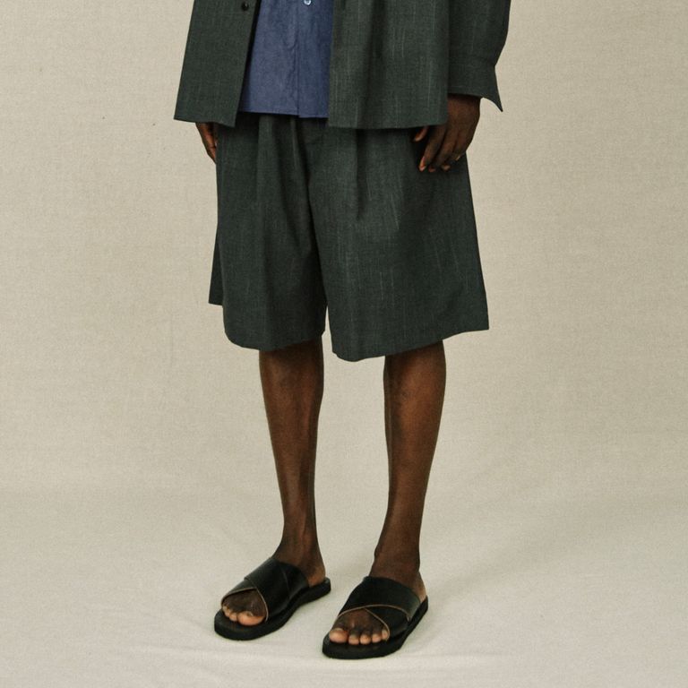 クラシックなスラックスをベースに製作を行なった本作。フロント2タック、後身頃ウエストゴム仕様のワイドトラウザーショーツです。