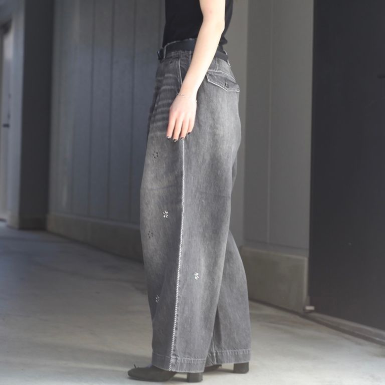 12.5ozの日本製デニム生地を使用し製作を行なった本作。花柄の刺繍が特徴的なデニムパンツです。