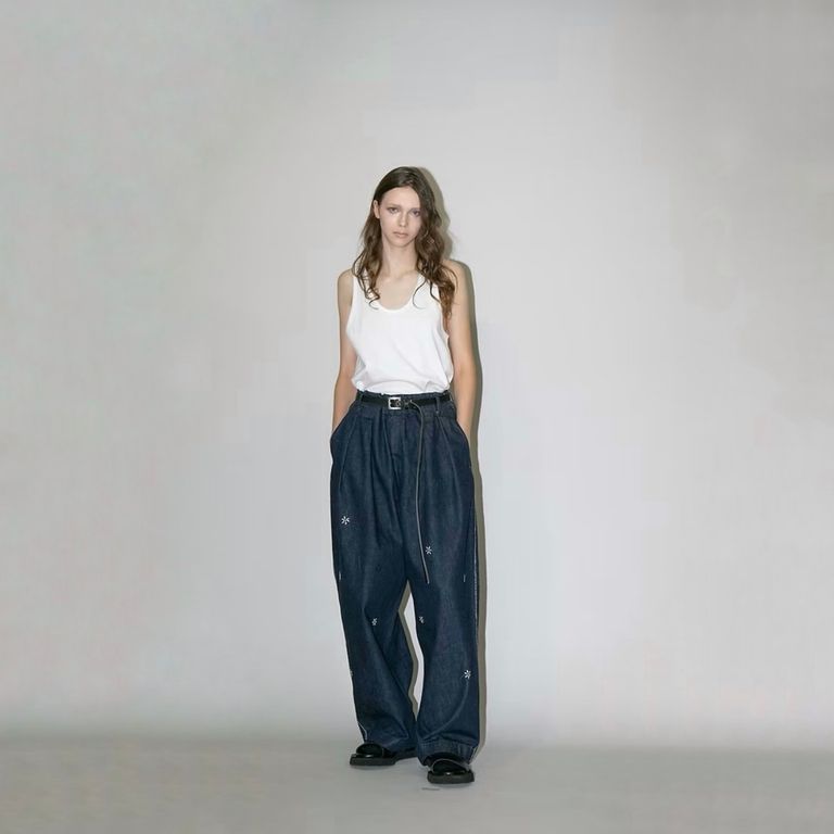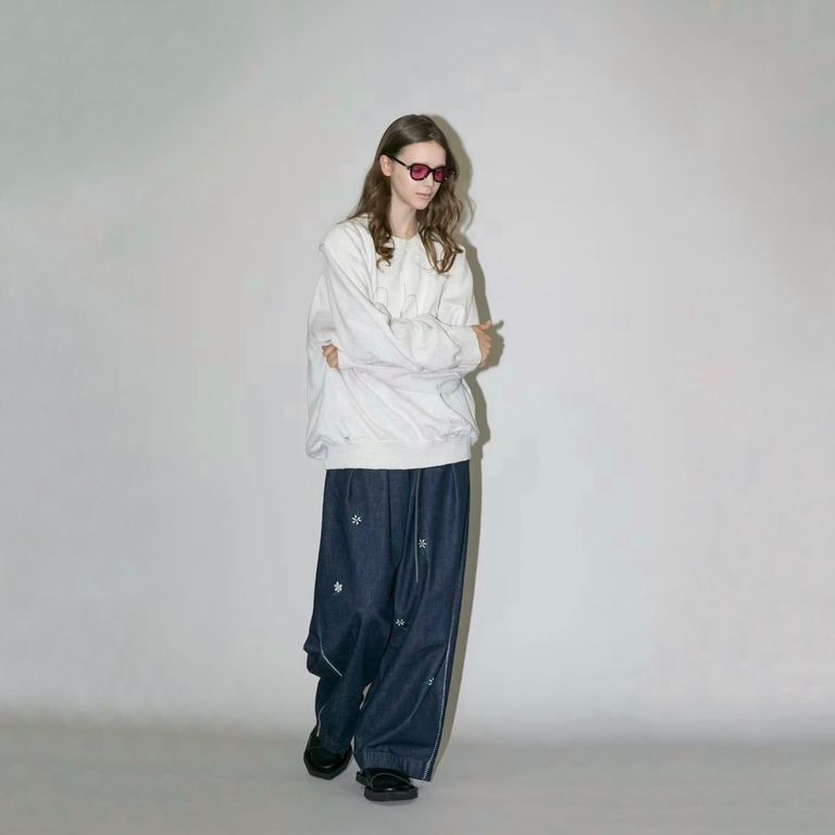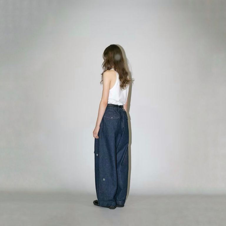12.5ozの日本製デニム生地を使用し製作を行なった本作。花柄の刺繍が特徴的なデニムパンツです。
