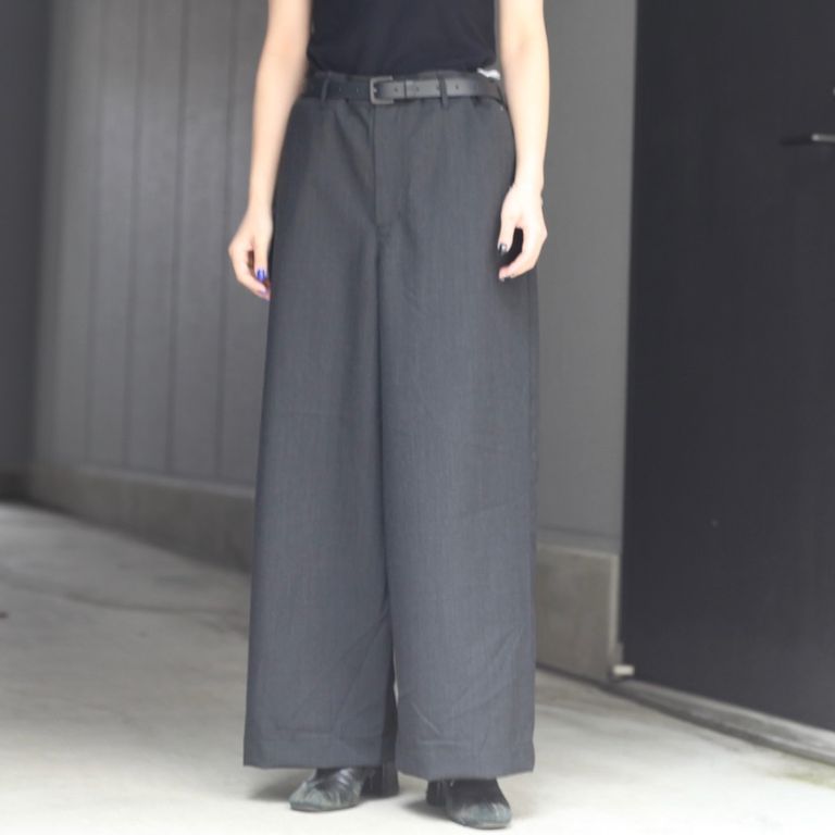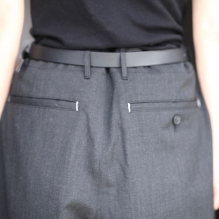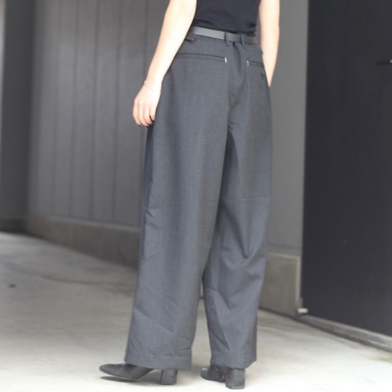 毛羽を抑えたクリア仕上げのタテヨコ72番手ウール混ウォッシャブルツイルを使用し製作を起こった本作。各ポケットに施されたステッチがさりげないアクセントのワイドパンツです。