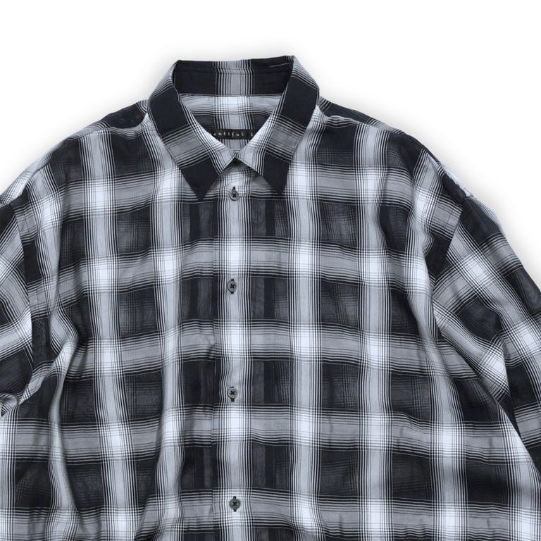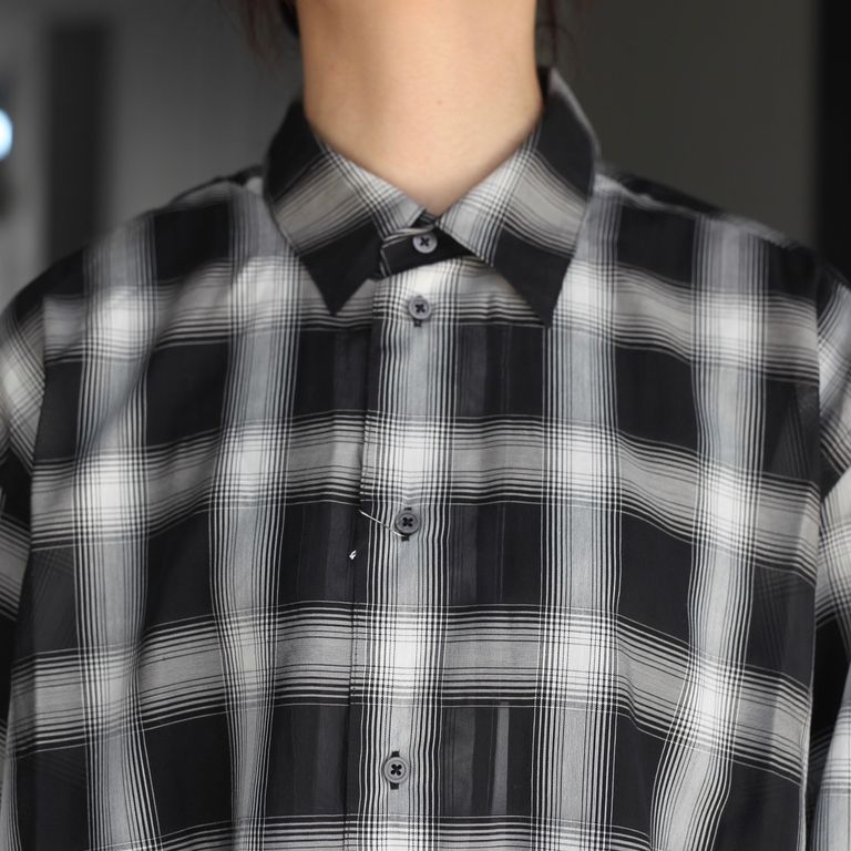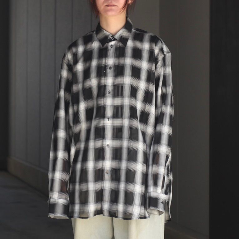 リサイクルポリを使用したシアー感のあるチェック生地を使用し製作をおこなた本作。程よくリラックスフィットなL/Sシャツです。