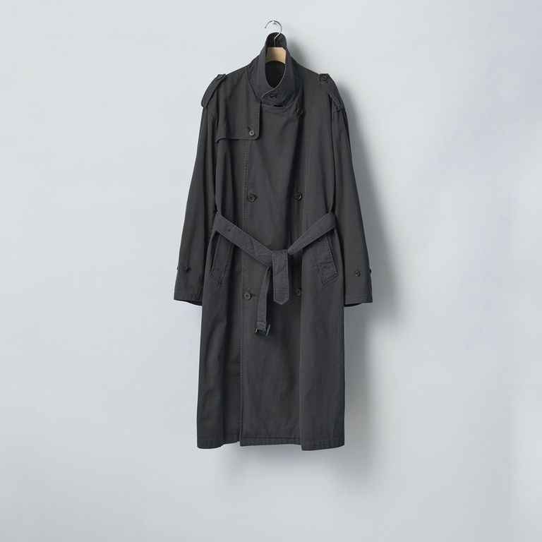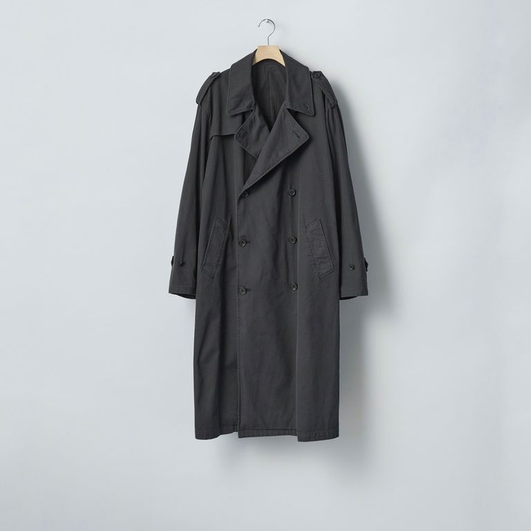 ビンテージのトレンチコートをベースに全体の表情、各ディテールを調整。縫製後にボールバイオ、オーバーダイの加工を施し、パッカリング、色味にニュアンスを出し、着古したような全体の印象に仕上げています。インナーのコントロール次第で幅広い季節でご愛用いただけるアイテムとなっております。