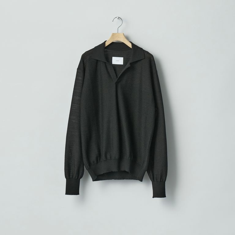 非常に軽量で、薄い編地でありながら構築的なシルエットに仕上げられた本作。3種類の糸を組み合わせインレイ風の編地で糸を渡らせながら編んだスキッパーニットです。