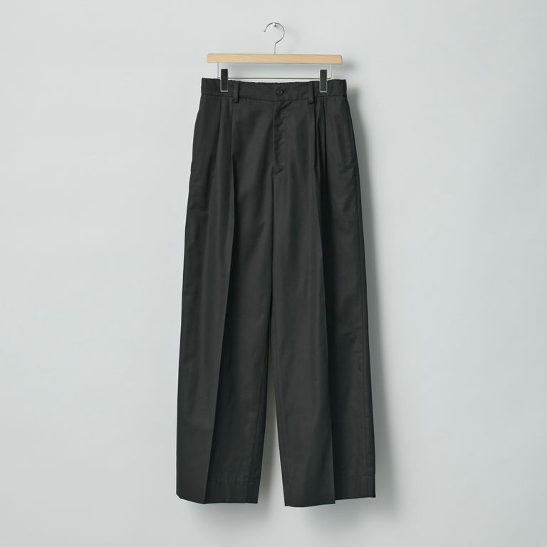 高密度のバーバリー素材を使用し製作を行なった本作。わたり幅から裾幅までワイドに設定したツータックイージートラウザーズです。
