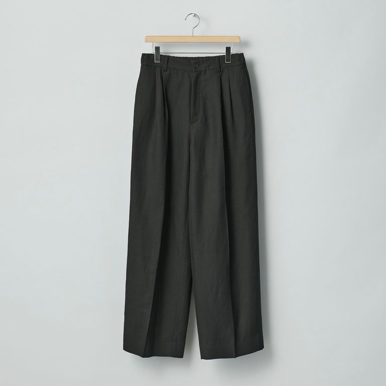 ヴィスコースとリネンの交織生地を使用し製作を行なった本作。わたり幅から裾幅までワイドに設定したツータックイージートラウザーズです。